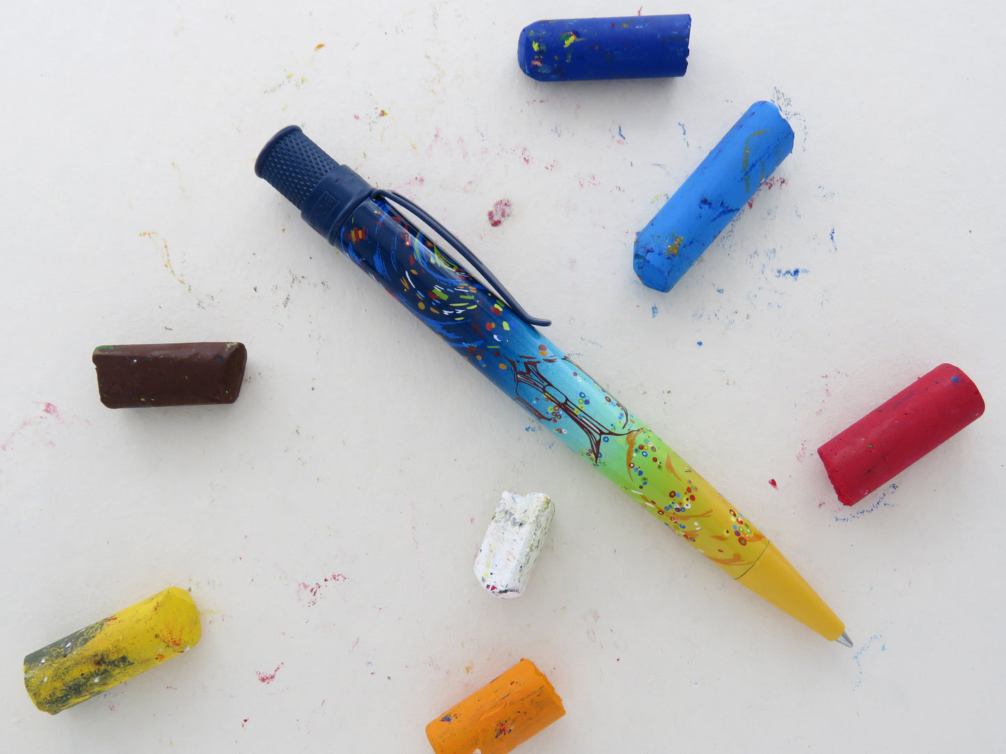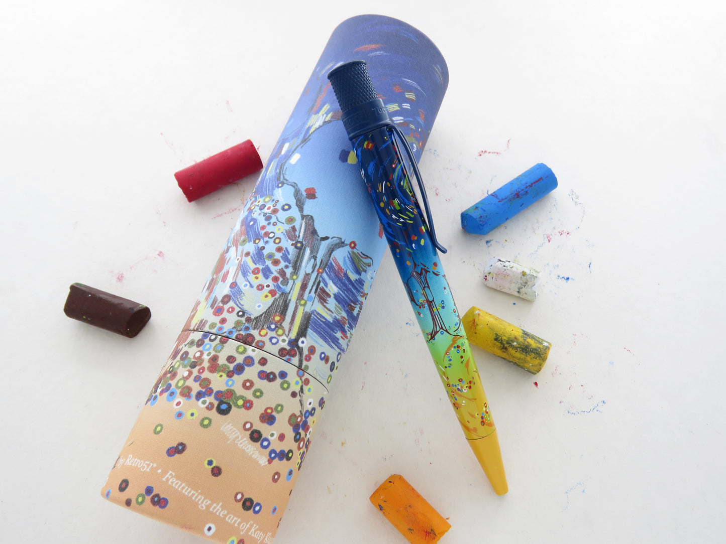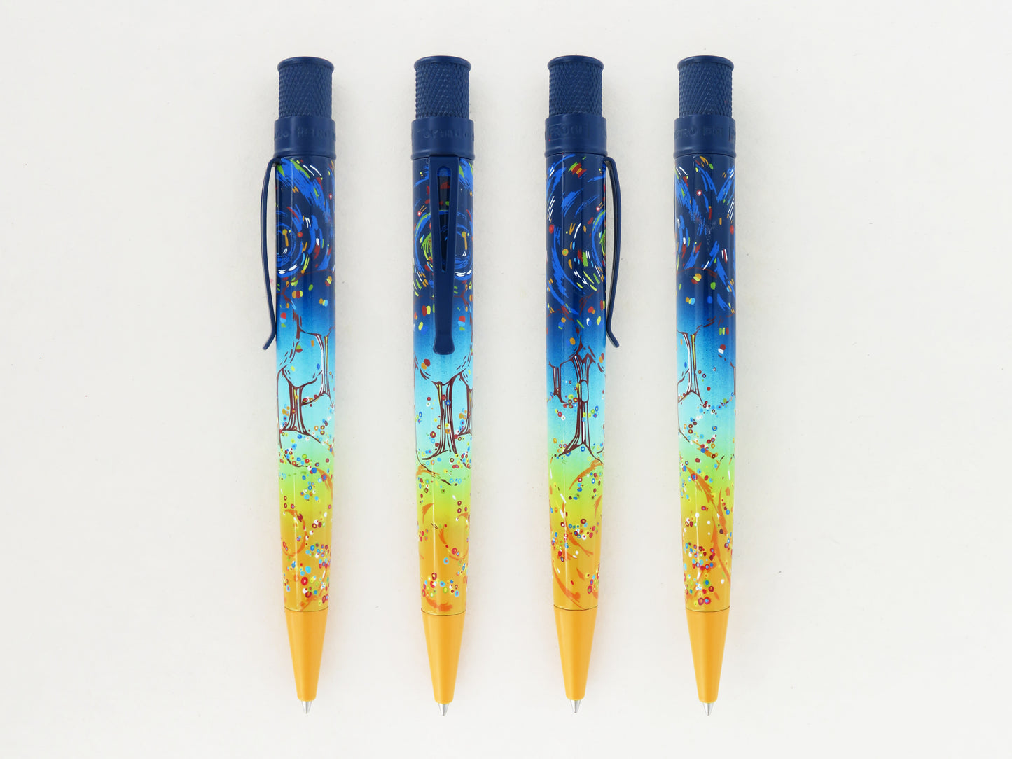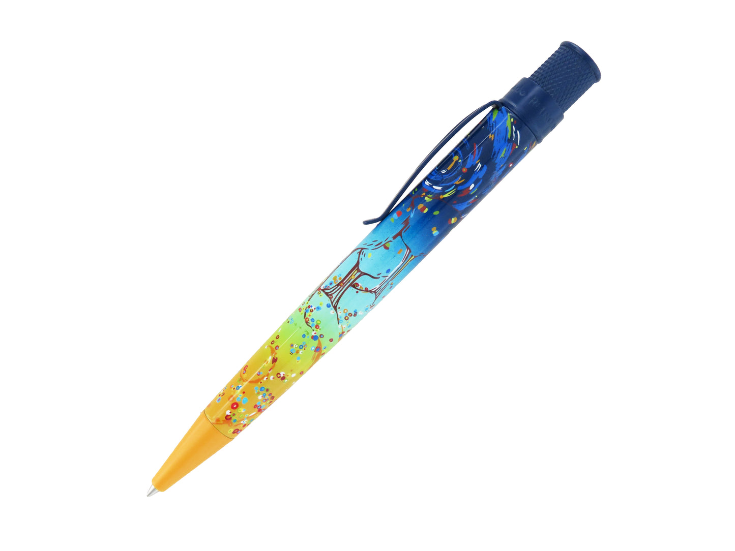 The latest Tornado Popper Day and Night is designed by pastel artist Katy Klassman and radiates with a dreamy, vibrant, Expressionist palette. Klassman designed this Tornado rollerball with a dramatic navy blue to orange ombre from the twist-top to the nose cone. The night sky flows down the pen barrel through the trees to the blossoms, creating a swirling and energetic current. This rollerball will invigorate and inspire you to take on the new year with gusto and moxie! Grab one of them today for plotting, planning, and dreaming up your 2024!